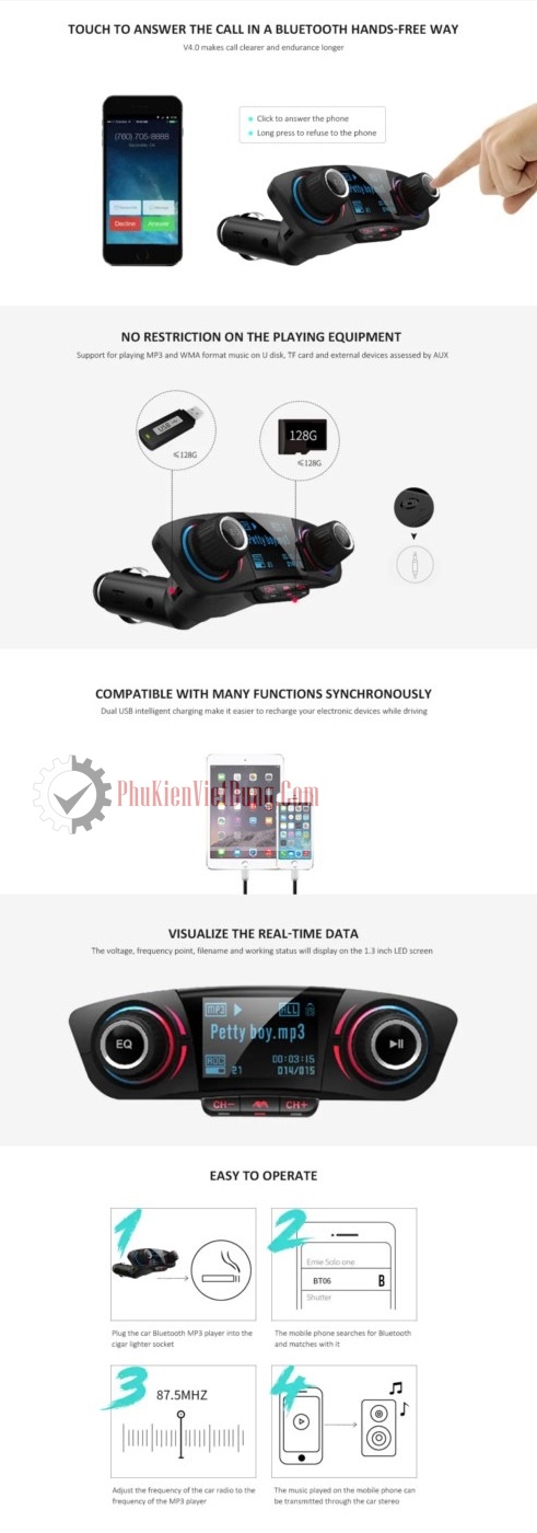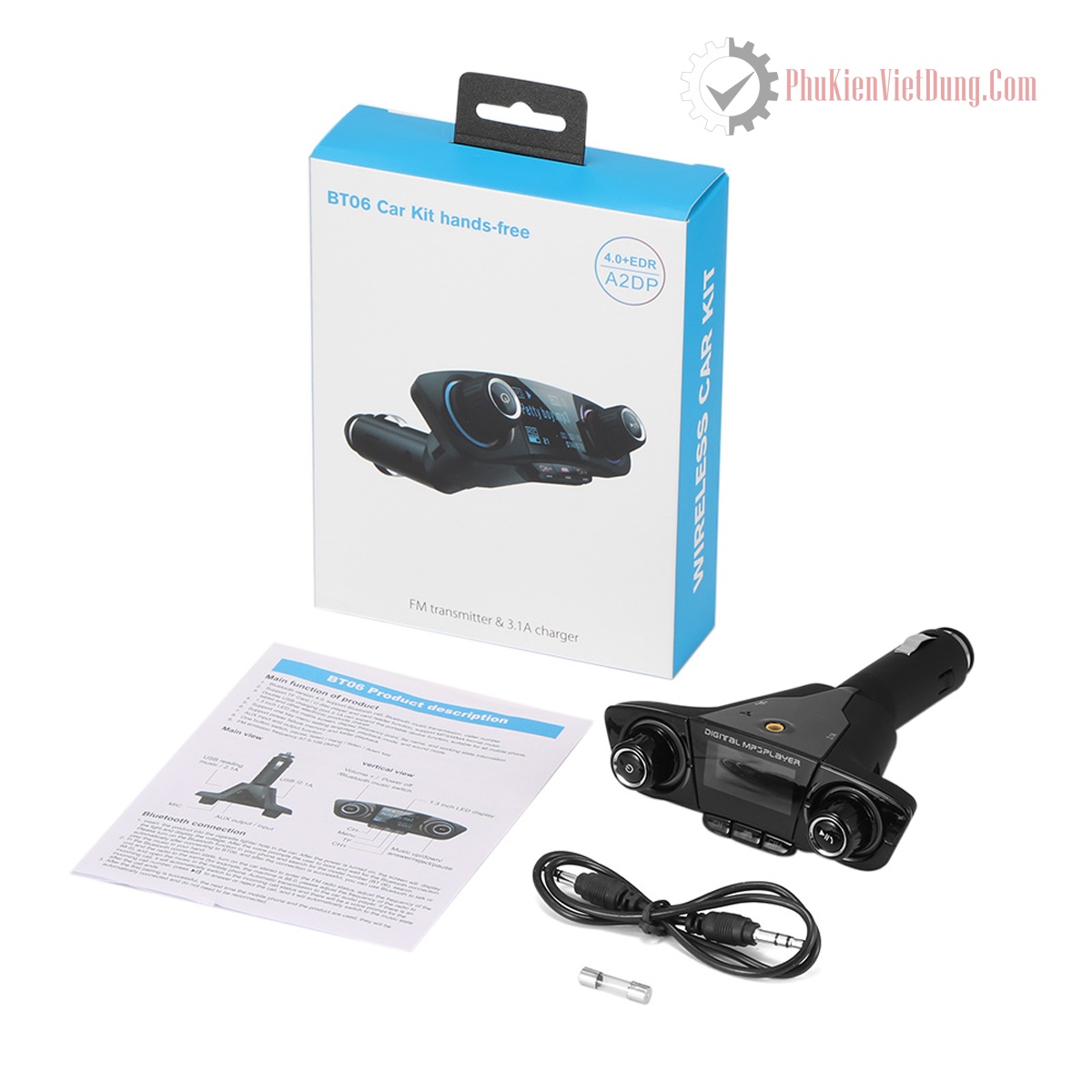 1. Ấn sản phẩm vào đầu tẩu thuốc trên xe hơi. Sau khi nguồn điện được bật, màn hình sẽ hiện màu đèn và hiển thị voltage. Sau khi có thông báo đợi kết nối bluetooth, hãy bật bluetooth trên thiết bị điện thoại của bạn, và tìm tên bluetooth "BT 06", và chọn vào đó. Sau khi ghép đôi 2 thiết bị xong, bạn có thể nói chuyện hoặc chơi nhạc bằng các phím bấm tay trên thiết bị.